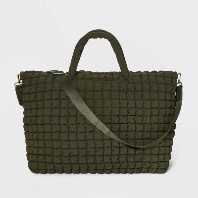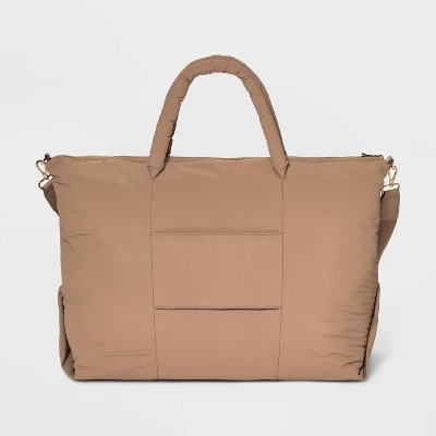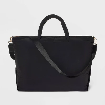 Make weekend trips easier and more convenient with your belongings handy in the Athleisure Soft Puff Weekender Bag from A New Day™. This solid-color weekender bag features both interior and exterior pockets to help keep your cell phone and other items organized. Made with at least 90% recycled polyester, this bag feels super soft, and it comes with double handles and an adjustable strap to give you multiple carrying options.