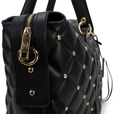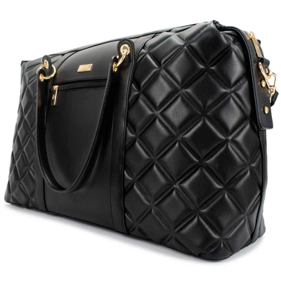 Combine fashion and functionality with this vegan leather weekender bag. The Quilted weekender is a cabin-friendly medium-sized bag with decorative rivets, a spacious main compartment and zip-top closure. The exterior has one rear zippered pocket with a removable shoulder strap. The interior has a monogram lining with pockets to organize small items.