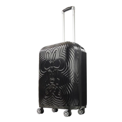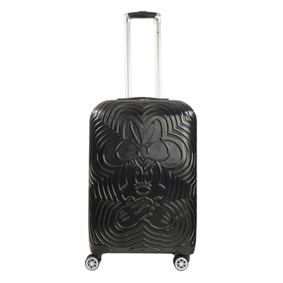 The adorable and popular Minnie Mouse shows a playful on the front of this hard-sided suitcase that is perfect for checking in for your next vacation. -Made with durable ABS Plastic and Pc film with a playful molded Minnie Mouse on the front. -Supported on 8 stable spinner wheels for hassle-free wheeling. -Convenient aluminum telescopic handle is easy to grip. -Sizeable polyester-lined main compartment is divided for easy organizing. -Interior includes 2 mesh zip pockets and a zip wet dry compartment for personal essentials. -Clothing compression straps help prevent contents from shifting/wrinkling.-Retractable top carry handles for loading into trunks, cars, and overhead bins.-Easy to spot clean. -5 year warranty. -Silver hardware.-26H X 16W X 11D-Imported.-This product may contain a chemical known by the state of California to cause cancer, birth defects, or other reproductive harm. www.p65warnings.ca.gov