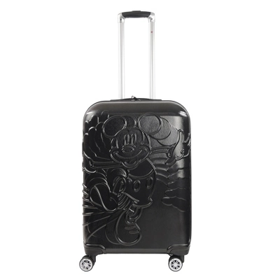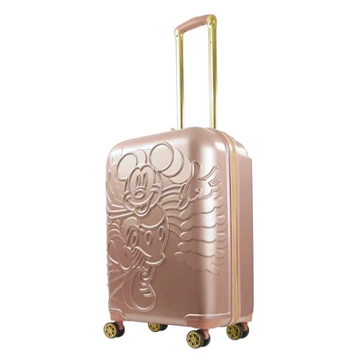 Embossed Mickey Mouse is printed on the front of this hard-sided spinner luggage that is perfect for your next long destination-Made with durable ABS Plastic and Pc film with a Running molded Mickey Mouse on the front. -Supported on 8 stable spinner wheels for hassle-free wheeling. -Convenient aluminum telescopic handle is easy to grip. -Sizeable polyester-lined main compartment is divided for easy organizing. -Interior includes 2 mesh zip pockets and a zip wet dry compartment for personal essentials. -Clothing compression straps help prevent contents from shifting/wrinkling.-Retractable top and side carry handles for loading into trunks, cars, and overhead bins.-Easy to spot clean. -5 year warranty. -Gold hardware.-26H X 16W X 11D-Imported.-This product may contain a chemical known by the state of California to cause cancer, birth defects, or other reproductive harm. www.p65warnings.ca.gov