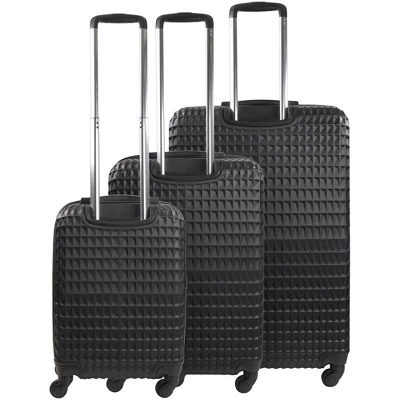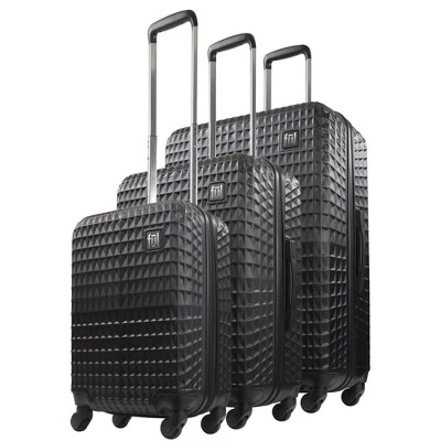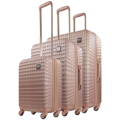 NYC’s modern building and vintage glass windows were the inspiration behind the new Geo textured pattern. In stunning rose gold, this 3-piece hard-sided spinner suitcase luggage set with a carry-on and two checked bags are the perfect travel set for easy spotting at baggage claim. They are supported on 4 spinner wheels for gentle, 360-degree movement for easy rolling. -Comes with 31, 26, 22 inch luggage.-Made with durable ABS plastic with a polycarbonate film for extra protection against the elements. -Gentle, 360 degree movement on 4 spinner wheels. -Dependable telescopic pull handle provides hassle-free transportation.-Sizeable polyester-lined main compartment is divided for easy organizing. -Compression straps help you pack more items and prevent contents from spilling.-Double zippers.-31″ and 26″ luggage comes with a retractable top and side carry handle for loading into trunks, cars, and overhead bins. -22″ luggage comes with a retractable top carry handle for loading into trunks, cars, and overhead bins. -22″ IS Expandable for more space with a 2 inch zipper gusset.-Black hardware.-Easy to spot clean. -5 year warranty-31H X 19.5W X 11.5D-Imported.-This product may contain a chemical known by the state of California to cause cancer, birth defects, or other reproductive harm. www.p65warnings.ca.gov
