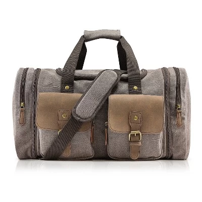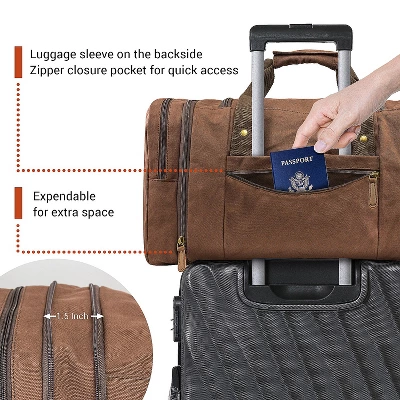 - CONVENIENT & VERSATILE: Can be used as carry-on bag on most airlines and flights, duffle bag, weekender, travel bag luggage, gym bag, or messenger bag with the removable and adjustable shoulder strap. The luggage sleeve allows you to slide the bag over the standard handle of a rolling suitcase or luggage for easy transport. 5 metal studs on the bottom keep the bag off the ground. 2 D-Ring on both sides to attach carabiner for your convenience.