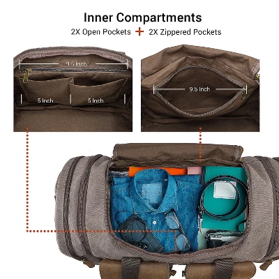 - MULTI-FUNCTIONAL COMPARTMENTS: Double zipper closure spacious main compartment with 3 internal pockets, 1 zipper closure and 2 open. There are also 2 external zipper closure organizational pockets, the larger one is at the bottom of the weekender bag and can be used to keep your shoes, dirty clothes, or wet towels separate from the main compartment, and the smaller one is also the luggage sleeve that allows easy access to small accessories and daily essentials.