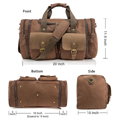 - MATERIAL, SIZE & COLOR: Made with premium quality splash proof Polyester material and durable PU leather. Sturdy stitching and heavy duty material. Weekender Bag measures approximately H15 x W20 x D9 in. The spacious double zipper closure bottom pocket measures approx. W18 x H4 x D9.