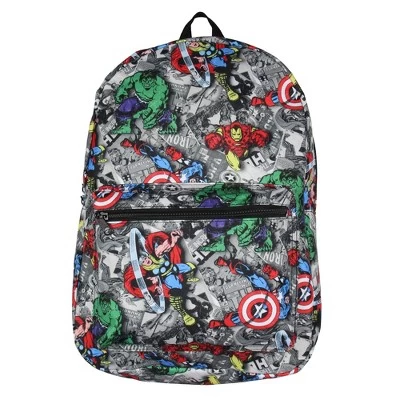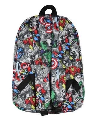 This is an officially licensed Marvel Avengers Backpack. It features a wonderful allover pattern of 4 superheroes from the Avengers, Captain America, Thor, Hulk, And Iron Man along with vintage comics. It has a front zipper closure pocket that is perfect for utensils like calculators, pens, pencils, and more! The main inner compartment features a laptop pocket with a padded back that is perfect for protecting tablets, cell phones, and personal computer laptops. Makes a great travel backpack as well, with an easy-carry top handle and adjustable shoulder straps. This makes a great kids backpack and adult backpack. Manufacturer recommended age: 14 years and older