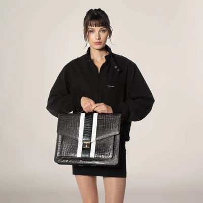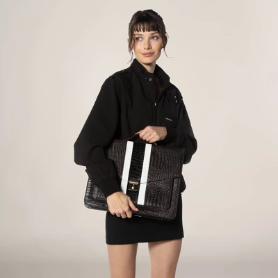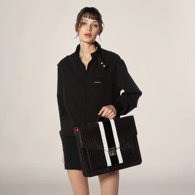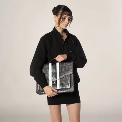 Flap opening with space large enough to fit your tablet or a small laptop. Its elegance is completed with just enough professional look and feel. Front pocket to hold your phone and small accessories, and a lock and key closure, the perfect accessory for work and play.