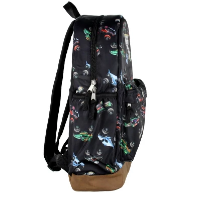- BACKPACK DESIGN – The backpack features an all-over print of some of Monster Jam’s fan-favorite cars: Dragon, Zombie, Grave Digger, and Megalodon, all against a black background.
