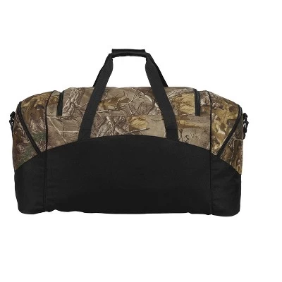 This rugged duffel features the outdoorsy Realtree Xtra camo pattern. 600 denier polyester canvas with 210 denier polyester lining D-shaped zippered entry for easy access in main compartment Two large zippered end pockets Two exterior zippered pockets on front Padded handle Detachable adjustable shoulder strap Dimensions: 12.75 h x 27.25 w x 13.5 d; Approx. 4 690 cubic inchesNote: Bags not intended for use by children 12 and under. Includes a California Prop 65 and social responsibility hangtag.