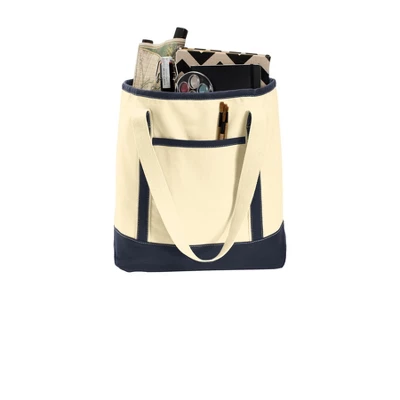 Perfect for the beach shopping and events these durable totes have open tops contrast handles and contrast bottoms for classic good looks. 15.5-ounce 100% cotton canvas body; 11-ounce 100% cotton canvas handle trim and bottom Sturdy reinforced webbing handles Exterior front pocket for easy decoration access Interior hanging pocket with hook and loop closure to secure valuables Dimensions: 16.5 h x 14 w x 7.5 d; Approx. 1 732 cubic inchesNote: Bags not intended for use by children 12 and under. Includes a California Prop 65 and social responsibility hangtag.