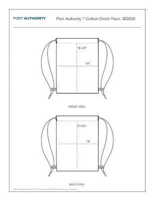 This soft cinch has a smooth flat surface so its perfect for direct to garment printing. 100% cotton sheeting Dyed-to-match drawcords closure Dimensions: 15.5 h x 13.5 wNote: Bags not intended for use by children 12 and under.