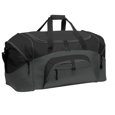 Our best-selling budget-friendly duffel is sized for for sport gear. 600 denier polyester canvas with 210 denier polyester lining D-shaped zippered entry for easy access in main compartmentTwo large zippered end pocketsTwo exterior zippered pockets on frontPadded handleDetachable adjustable shoulder strapTwo front zippered pocketsTwo large side pockets Dimensions: 12.75 h x 27.25 w x 13.5 d; Approx. 4 690 cubic inchesNote: Bags not intended for use by children 12 and under. Includes a California Prop 65 and social responsibility hangtag.
