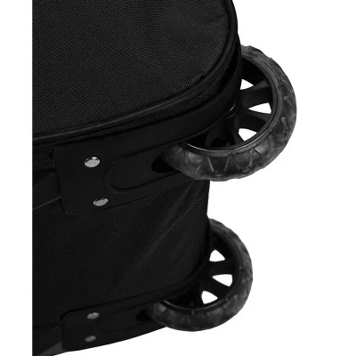 Travel in style with this great soft-sided rolling duffle bag. Bag features a heavy-duty polyester construction. Inline skate wheels for superior mobility, internal retractable hide-away handle system, U-top opening provides easy access to roomy zipper secured main compartment. Two front zipper-secured compartments, adjustable ergonomic shoulder strap. Made of 600 denier heavy duty polyester. Measures 36″L x 14″W x 15″H