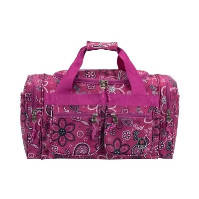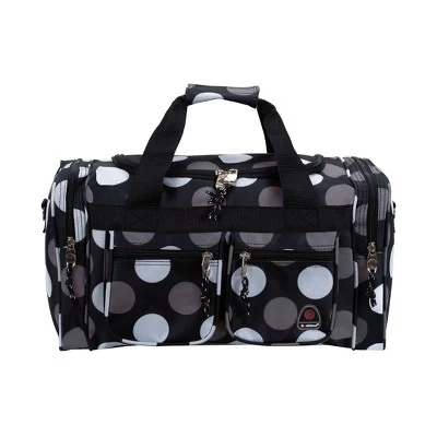 Compliment your Rockland Luggage collection with this stylish carry-on flight tote/duffle bag. This fashionable polyester fabric duffel will turn heads anywhere your travel takes you. Bag is constructed of heavy-duty 600 denier polyester. Features a U-top opening that provides easy access to main zipper secured compartment, two front zipper secured compartments and an adjustable ergonomic shoulder strap. Measures 19”L x 10.5”W x 8”H