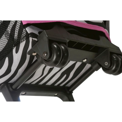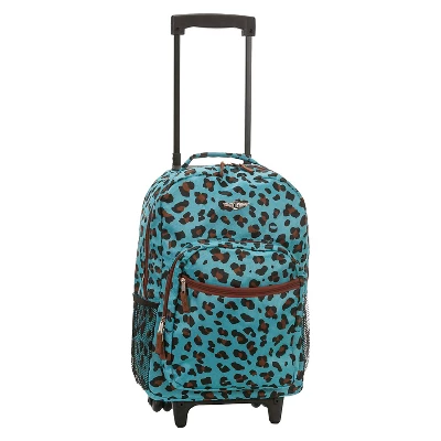 Rolling backpack with double skate wheels. Measures 13in in lenght x 10 in wide x 17″ high. Features include 2 zippered pockets on the front of the bag with one having a built-in organizer. Zippered main compartment opens to large storage opening, and two mesh side pockets. Fabric handle at the top and telescoping pull handle. Bag made of durable polyester with metal telescoping handle and heavy-duty plastic stand on bottom to keep the bag standing.