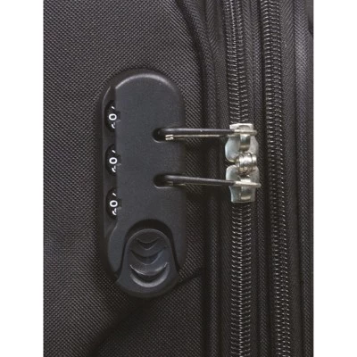 - Expands two inches for more packing capacity, 3-digit combination lock (Non-TSA), Fully lined interior features a zipper divider, Large mesh zipper pocket, and compression straps