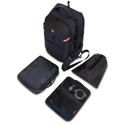 - Backpack includes a removable laundry/shoe bag, packing cube, and electronic accessories carrier