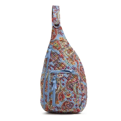 Wear this sling-style backpack over your back or across your front. Either way you carry it, you’ll be ready for all the adventures your day brings! Details: Exterior features two zip pockets (front pocket has a slip and two pen pockets). D-ring for keys on top of strap. Zip closure. Care Tips: Machine wash cold, gentle cycle, only non-chlorine bleach when needed; line dry