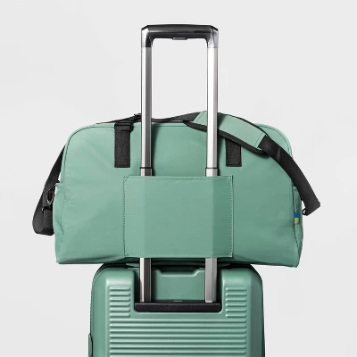 Prepare for a long weekend or a small trip with the help of this Basics Weekender Bag from Open Story™. This weekender bag is crafted from 100% recycled polyester, water-repellent fabric. It features a single spacious compartment with small accessory pockets, a padded laptop sleeve to accommodate an up to 15-inch laptop and a zip pocket for packing your essentials. The exterior is designed with a front and side zip pocket plus side slip pockets for extra storage space. Easy to carry across the shoulder thanks to the removable strap, this duffel bag features a web handle for carrying by hand. Designed in a dark ivy hue, it features a sleeve at the back for slipping over the telescoping handle of your luggage bag for effortless maneuverability.