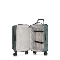 - TSA combination lock, 360-degree spinner wheels, push-button telescopic handle, top and side grip handles